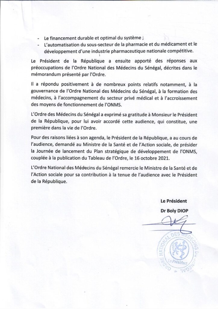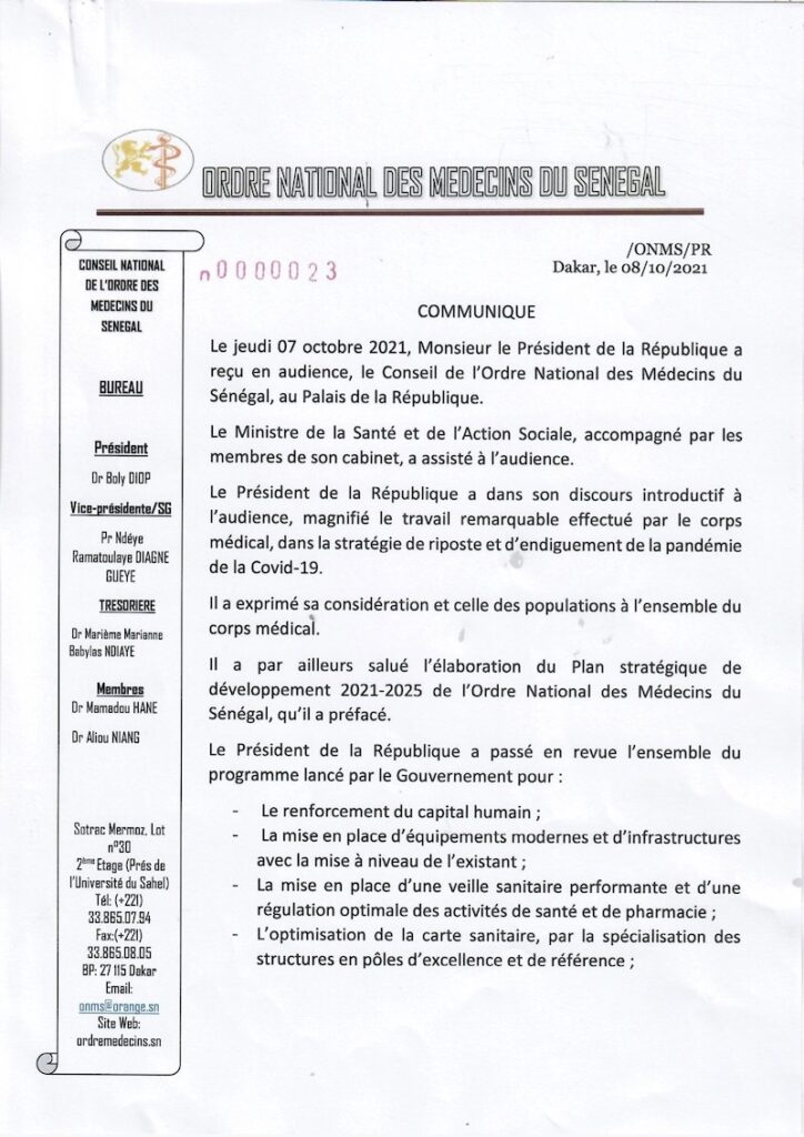 Communiqué audience avec le Président de la République du Sénégal
