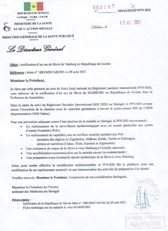 Lettre d’Information du Ministère de la Santé relative à la notification d’un cas de la fièvre de Marburg de la République de Guinée