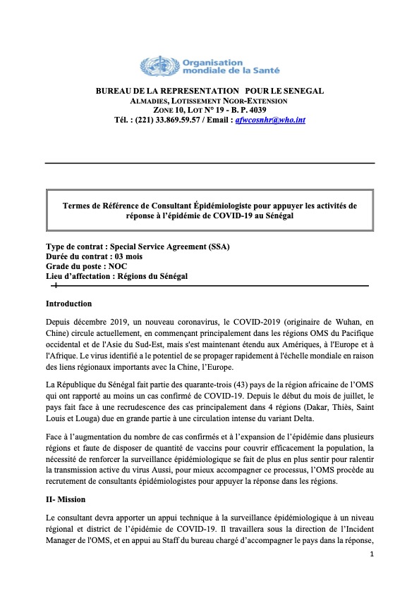 TdR Consultant Epidémiologiste COVID-19 Sénégal