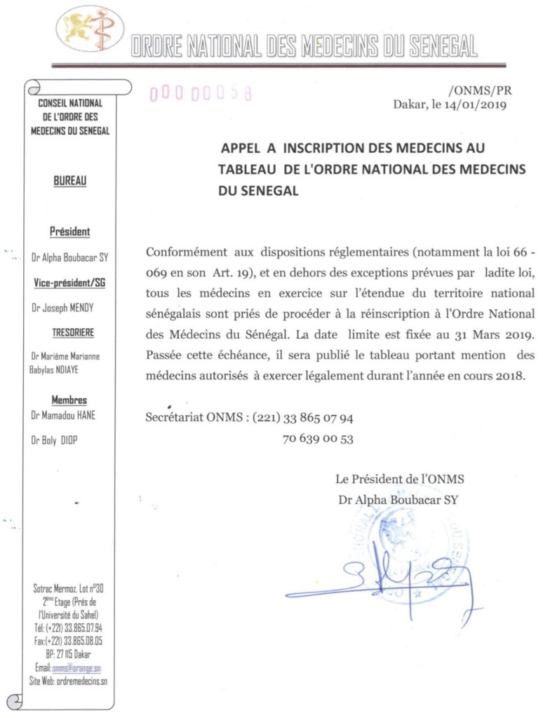 Le Président de l’Ordre National des Médecins du Sénégal à la profonde douleur de vous faire part du décès au Docteur Joseph Saint Clair DIOP Médecin Pédiatre, survenu le mardi 19 mars 2019 à Dakar, les obsèques auront lieu le samedi 23 mars 2019, la messe sera célébrée à 11 h à la Cathédrale de Dakar suivie de l’enterrement au cimetière catholique de Saint Lazard .